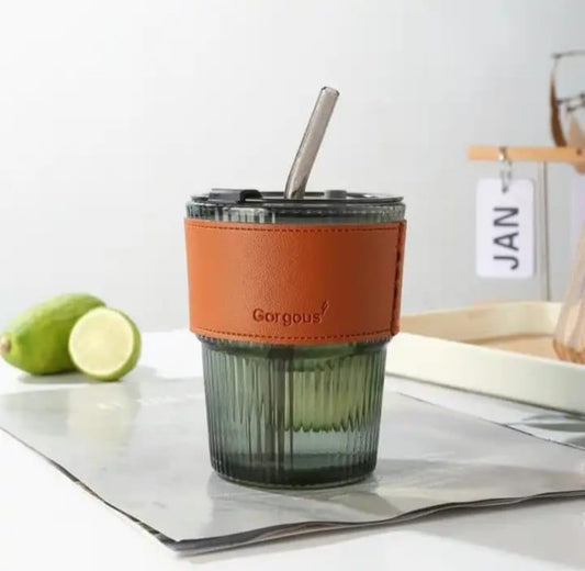 Glass Tumbler with Lid & Glass Straw Pack of 1, 450ml